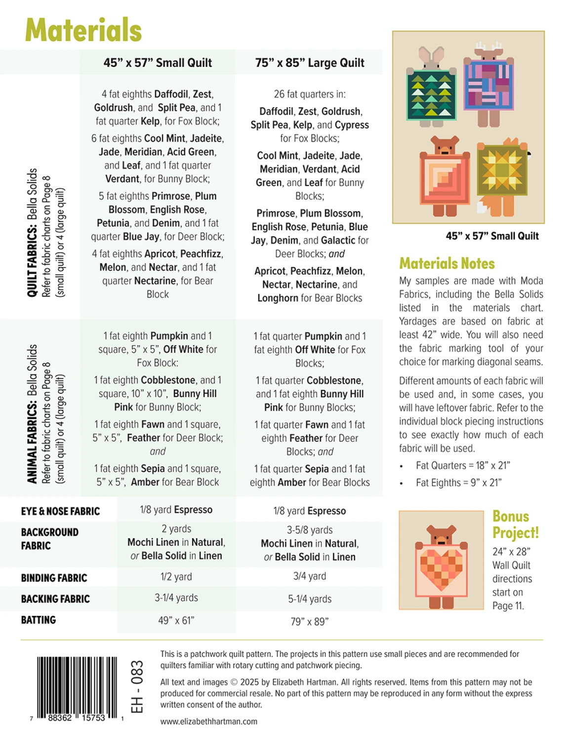 Who doesn’t love showing off a beautiful finished quilt? Show and Tell is a celebration of that feeling! This patchwork quilt features foxes, bunnies, deer, and bears — each holding up a different mini quilt. Make the 75″ x 85″ Large Quilt with 12 different blocks/quilts, or the 45″ x 57″ Small Quilt with 4 different blocks/quilts. The pattern also includes instructions for making a 24″ x 28″ mini quilt with a single block. Blocks are made with fat quarters and fat eighths. Refer to the pattern back for yardages. Solid and/or small, non-directional fabrics are recommended. This is a patchwork quilt pattern. (No templates or paper piecing are used.) The projects in this pattern include small pieces and are recommended for quilters familiar with rotary cutting and patchwork piecing.